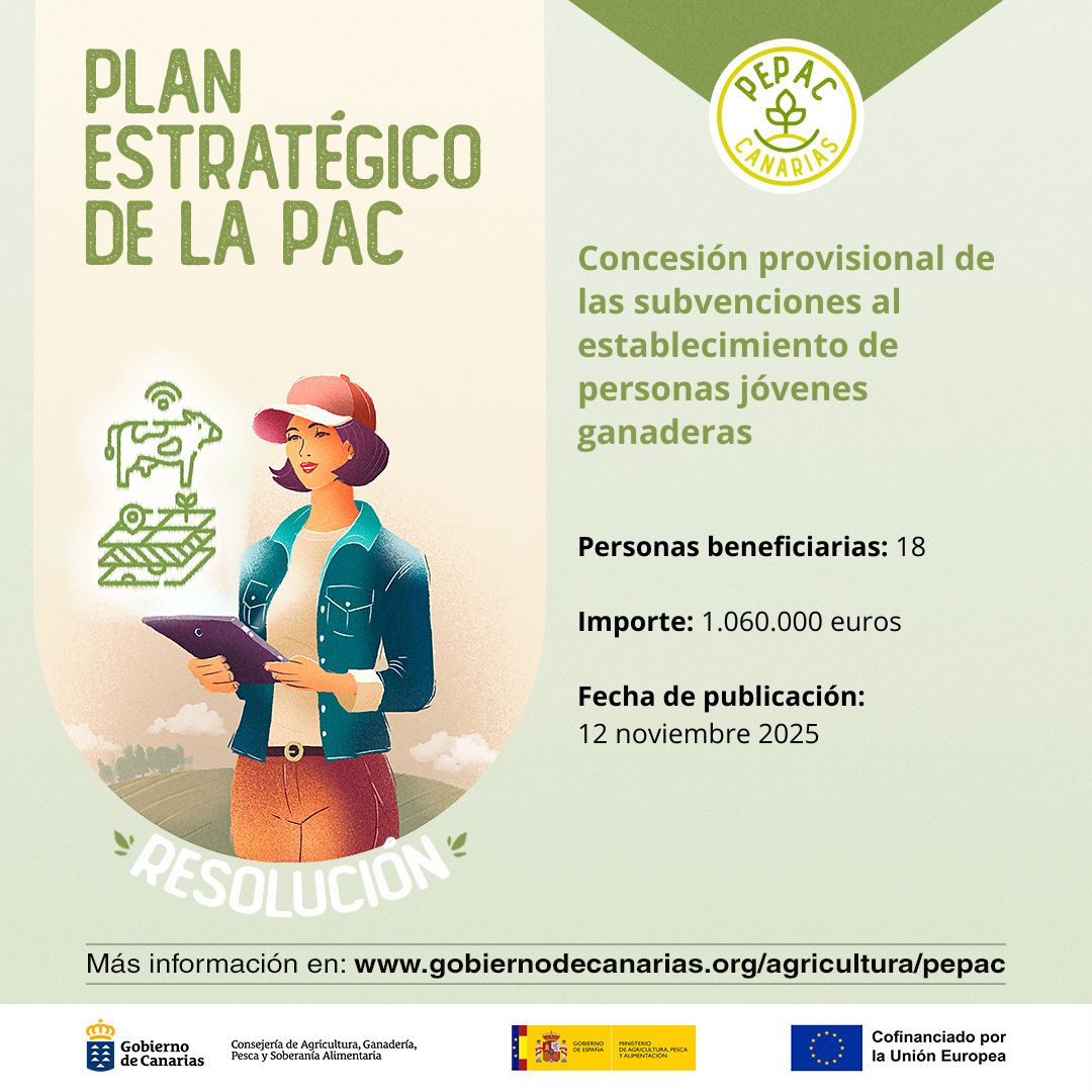 La Consejería de Agricultura, Ganadería, Pesca y Soberanía Alimentaria del Gobierno de Canarias publicó ayer la resolución de concesión provisional de las subvenciones destinadas al establecimiento de personas jóvenes ganaderas del Plan Estratégico de la Política Agraria Común (PEPAC) por importe de 1.060.000 euros divididos en dos anualidades.