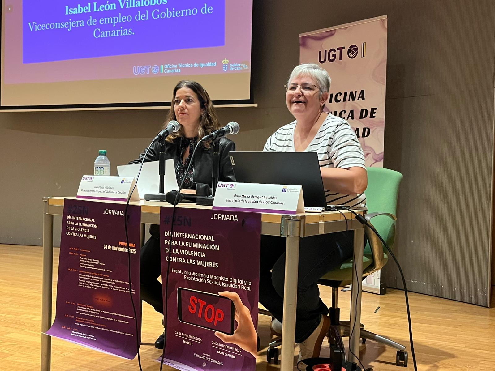 La viceconsejera de Empleo del Gobierno de Canarias, Isabel León, ha participado esta mañana en la Jornada 25N, organizada por UGT con motivo del Día Internacional para la Eliminación de la Violencia Contra las Mujeres. Durante el evento se presentó la Guía de derechos laborales de las trabajadoras víctimas de la violencia de género y víctimas de violencias sexuales, editada por la Oficina Técnica de Igualdad de UGT Canarias, que financia la Consejería de Turismo y Empleo del Gobierno regional, a través de la Dirección General de Trabajo.