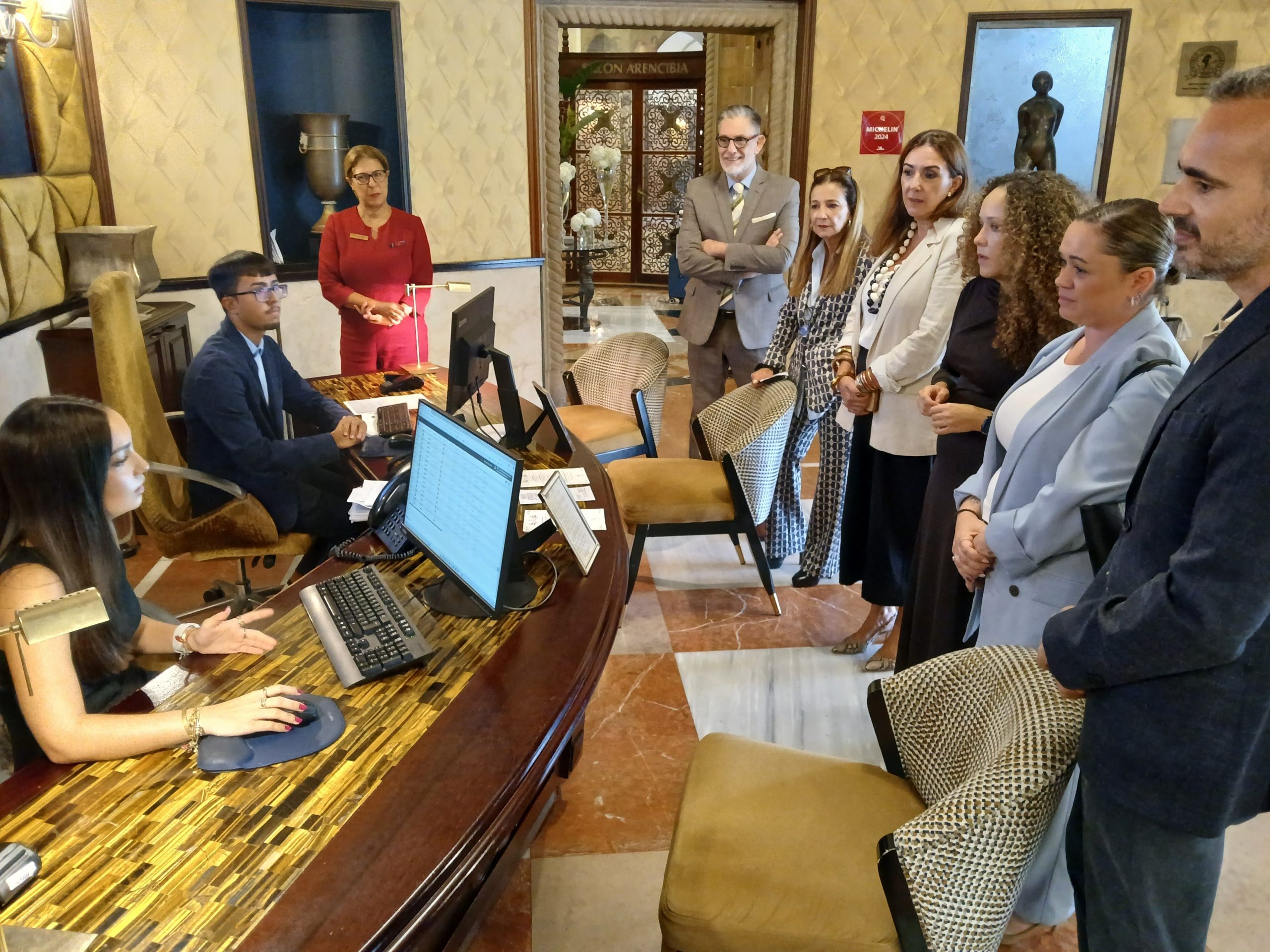 La consejera delegada de Hecansa, Paola Plasencia; el consejero delegado de Gesprotur, Ignacio Solana; y la directora de Formación, Yurena Marrero, visitaron este lunes a los estudiantes que realizan prácticas en el Hotel Santa Catalina, en Las Palmas de Gran Canaria, para conocer los resultados de su aprendizaje en este establecimiento. Al encuentro también asistieron representantes del Grupo Barceló, entre ellos la directora regional para Canarias, Madeira y Cabo Verde, Pilar Parejo; la directora de Recursos Humanos, Sonia Álvarez; y el director de área de Gran Canaria, Alfonso Girón.