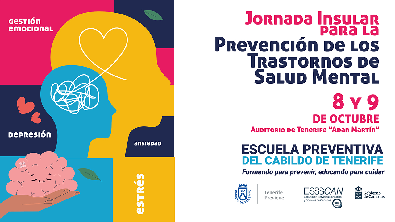 La Escuela de Servicios Sanitarios y Sociales de Canarias (ESSSCAN), dependiente de la Consejería de Sanidad del Gobierno de Canarias, en colaboración con la Consejería de Educación para la Prevención del Cabildo Insular de Tenerife, organiza la Jornada Insular para la Prevención de los Trastornos de Salud Mental, en el marco de la Escuela Preventiva y su Itinerario Formativo Insular 2025.