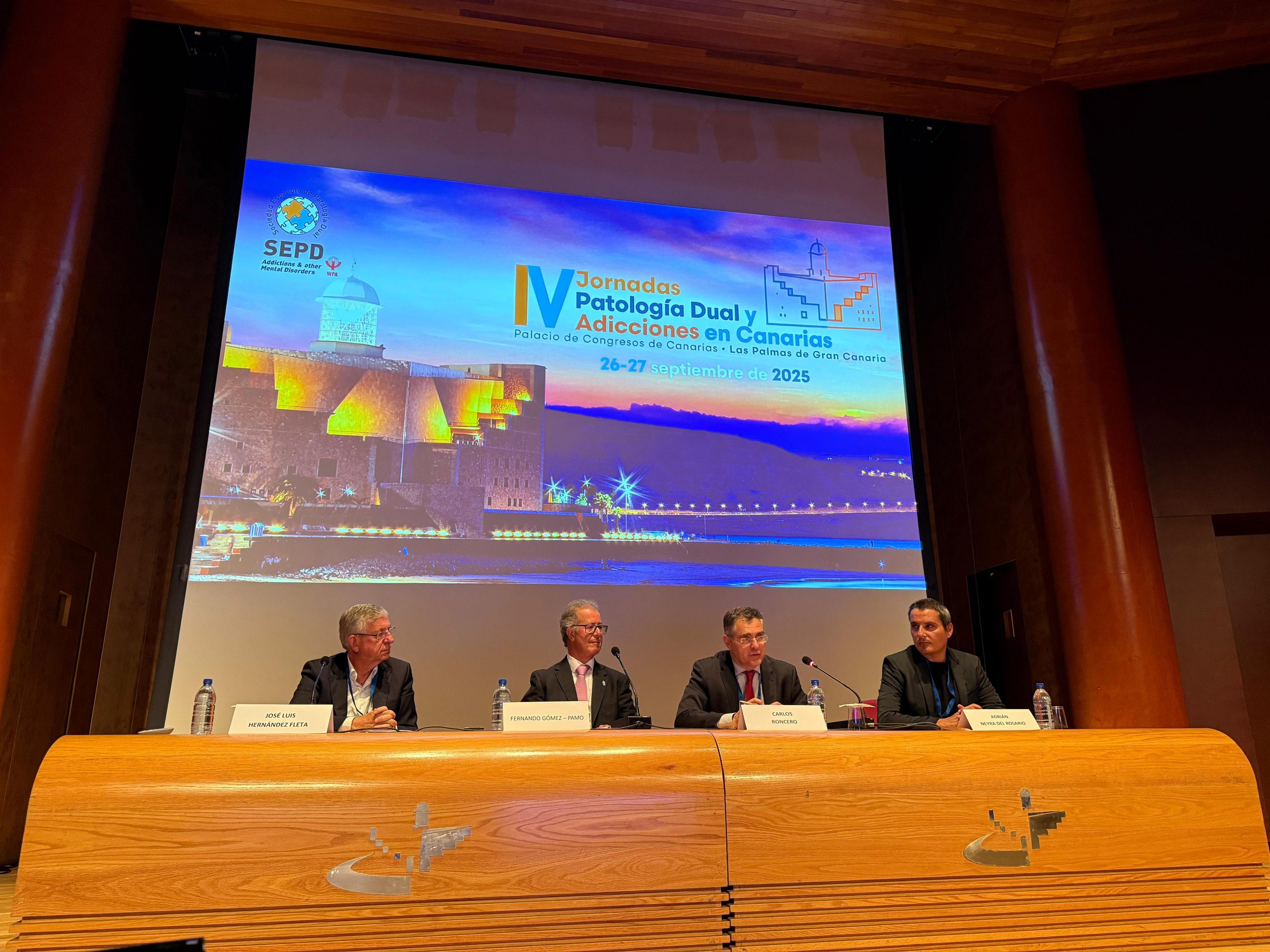 En el acto inaugural, Gómez-Pamo estuvo acompañado por el presidente de la Sociedad Española de Patología Dual, Carlos Roncero, el jefe de Servicio de Psiquiatría del Hospital Universitario de Gran Canaria Doctor Negrín, José Luis Hernández Fleta, y el presidente del comité organizador de la jornada, Adrián Neyra.