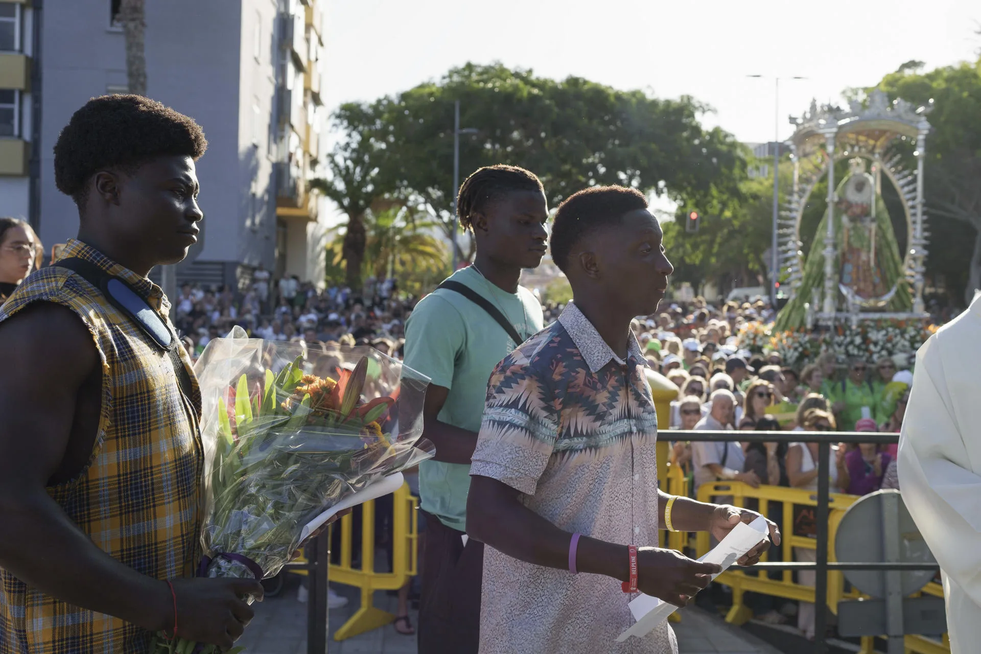Ante el silencio de los cientos de devotos que acompañan a la imagen en su peregrinar desde Candelaria hasta Santa Cruz de Tenerife, los jóvenes Abibo, Ousmane, Mor, Mbacke, Brithg y Paul han realizado una ofrenda floral a la imagen de la Virgen y tres de ellos han leído un texto porque, han dicho, «te sentimos entre nosotros y no solo queremos ofrecerte flores y canciones».
