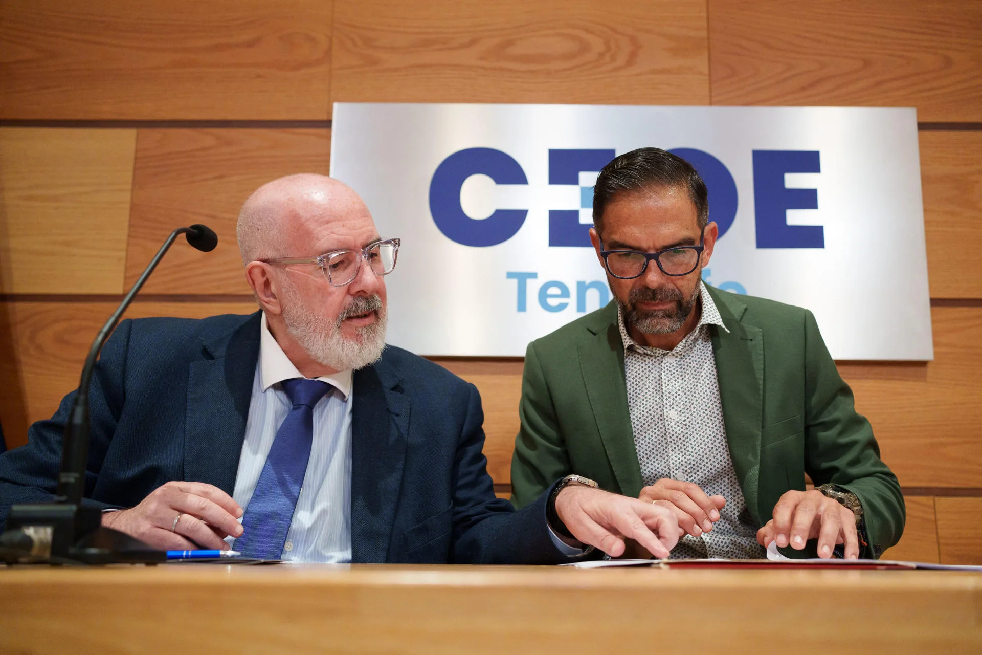 Los pormenores del informe sobre la evolución de la economía de Canarias al término del tercer trimestre de 2025 han sido presentados este viernes en rueda de prensa por el presidente de la CEOE tinerfeña, Pedro Alfonso, y por el director de Consultoría y Gestión Comercial de Corporación 5, José Miguel González.