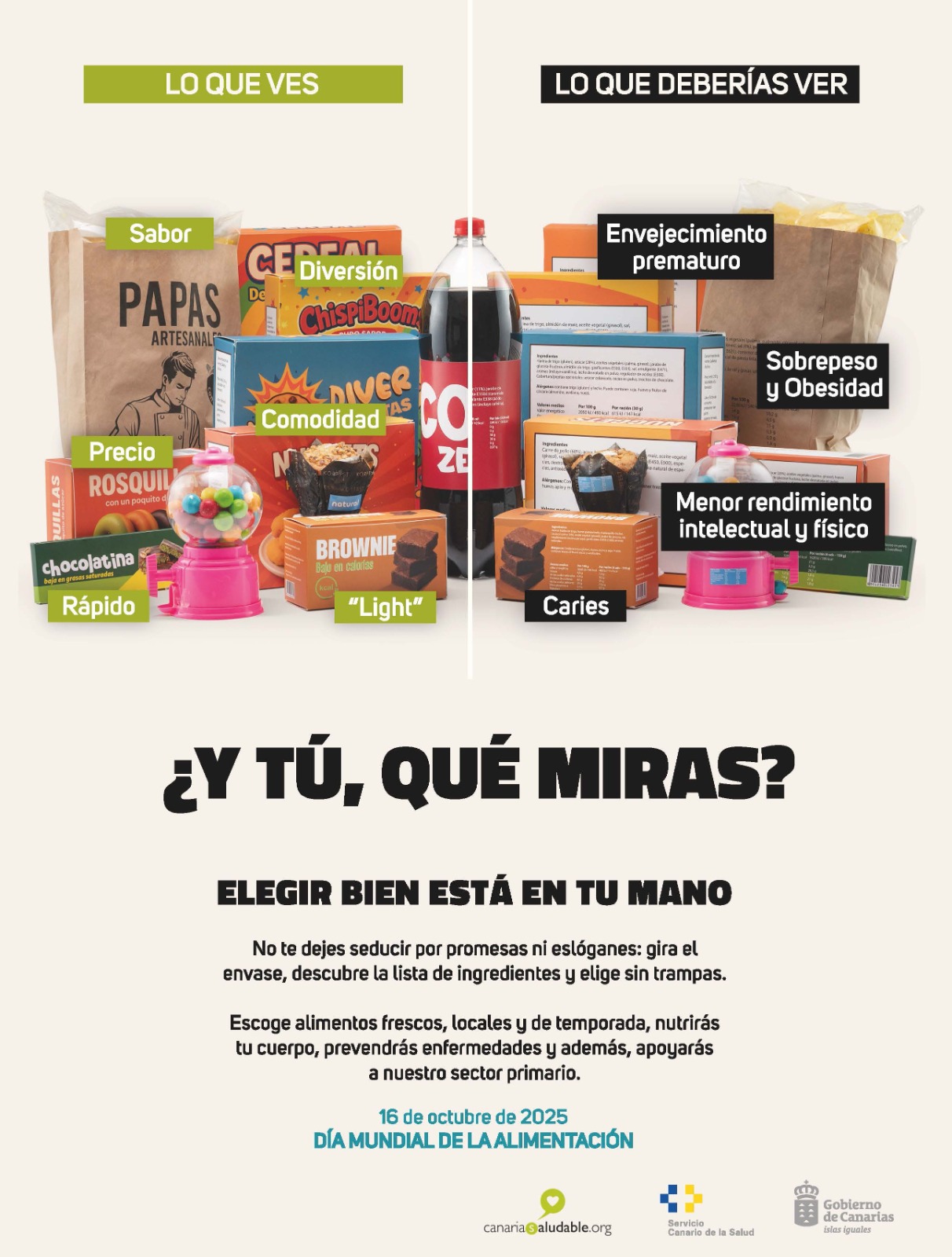 En este marco, Sanidad ha lanzado su propia campaña de sensibilización, bajo el lema “Y tú, ¿qué miras? Elegir bien está en tu mano”, para promover una alimentación equilibrada y respetuosa con el entorno. La iniciativa busca fomentar decisiones conscientes e informadas a la hora de elegir alimentos, apostando por opciones que beneficien tanto la salud como el medio ambiente.
