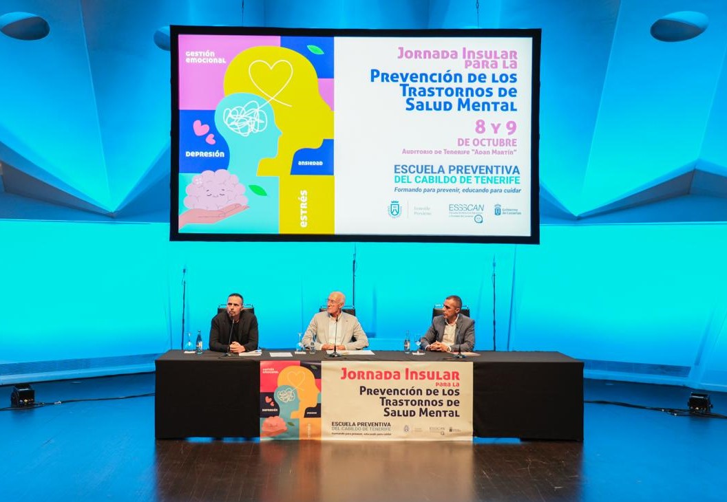 El director del Servicio Canario de la Salud (SCS), Adasat Goya, acompañado por la presidenta del Cabildo de Tenerife, Rosa Dávila, el consejero delegado de Educación para la Prevención del Cabildo, Juan Acosta, y el director de la Escuela de Servicios Sanitarios de Canarias (ESSSCAN), José Montelongo, participó este miércoles, 8 de octubre, en el acto inaugural de la Jornada Insular para la Prevención de los Trastornos de Salud Mental en Tenerife, actividad organizada por la Escuela de Servicios Sanitarios y Sociales de Canarias (ESSSCAN), dependiente de la Consejería de Sanidad del Gobierno de Canarias, en colaboración con la Consejería de Educación para la Prevención del Cabildo Insular de Tenerife, en el marco de la Escuela Preventiva y su Itinerario Formativo Insular 2025.