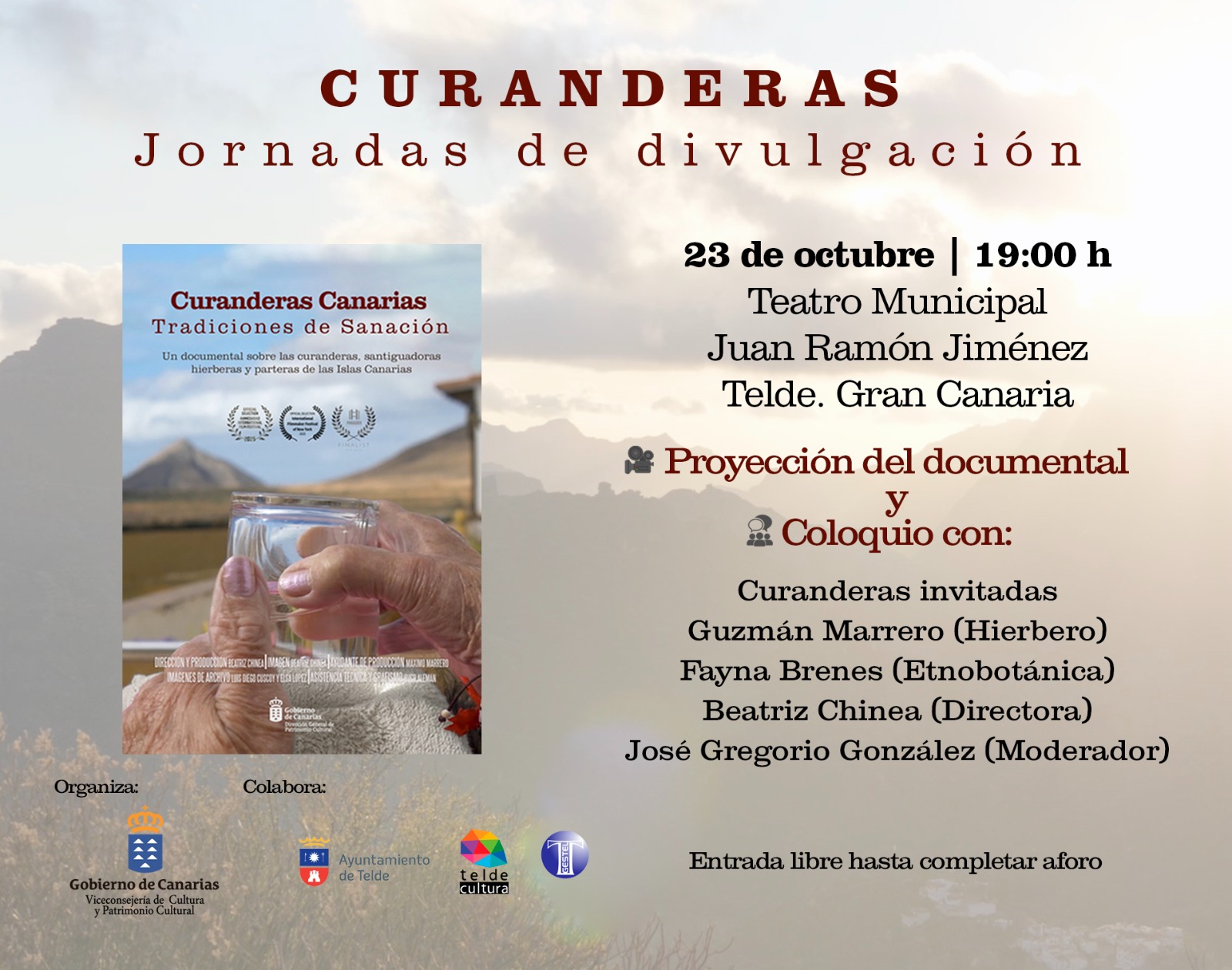 El documental ‘Curanderas Canarias. Tradiciones de Sanación’ se proyectará mañana jueves, 23 de octubre, a las 19:00 horas en el Teatro Municipal Juan Ramón Jiménez (Telde), dentro del ciclo de estrenos organizado por la Dirección General de Cultura y Patrimonio Cultural en las distintas islas del archipiélago. La película, dirigida y producida por Beatriz Chinea, rescata la memoria de curanderas, santiguadoras, yerberas y parteras como parte del patrimonio inmaterial de Canarias.