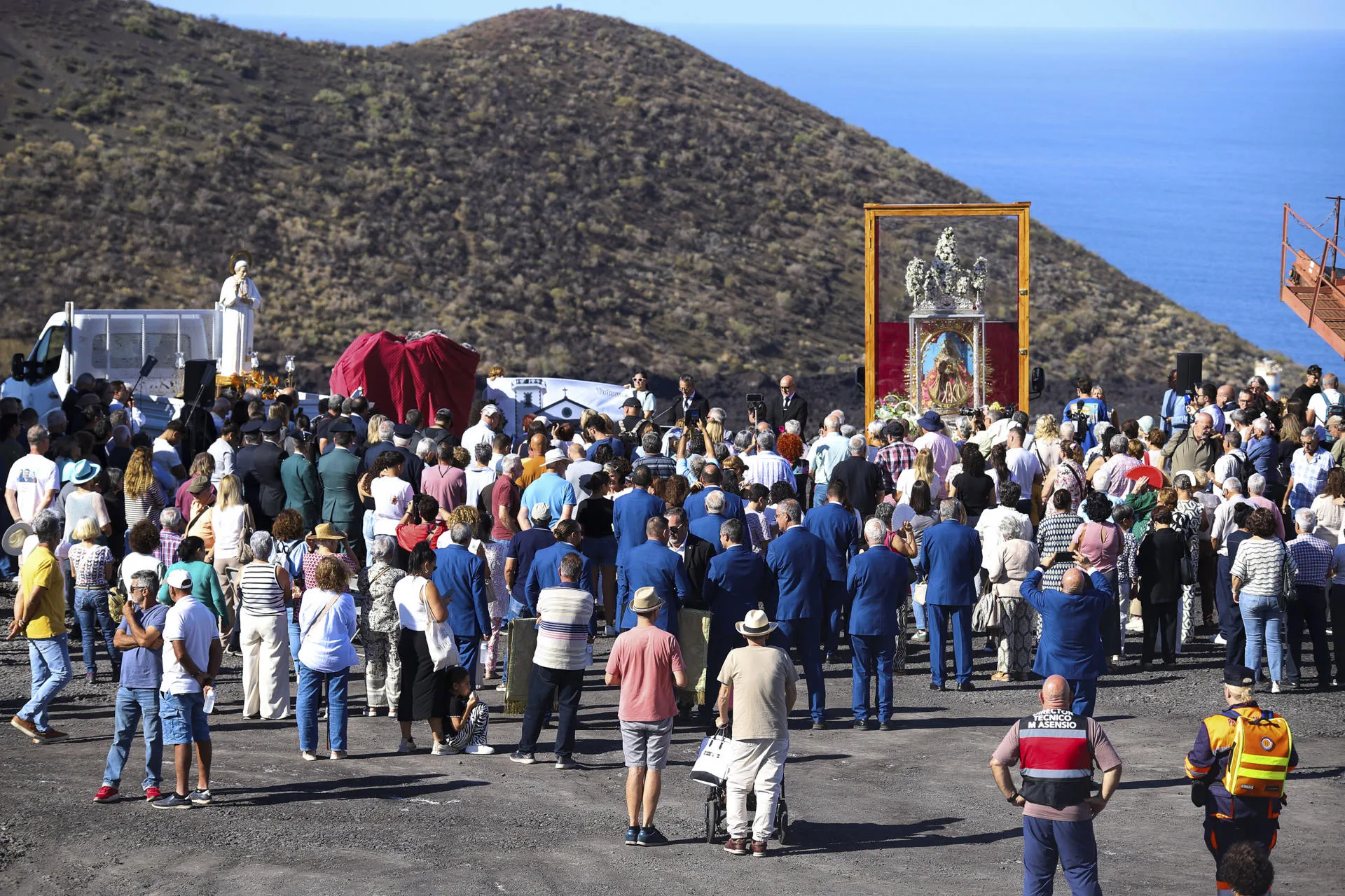 Allí, entre la escoria volcánica y los vestigios de lo que fue el corazón del pueblo, los vecinos se reunieron por primera vez sobre la colada del volcán en un acto cargado de simbolismo que se enmarca en la peregrinación que la imagen realiza por los catorce municipios de la isla con motivo del Año Jubilar de la Esperanza.