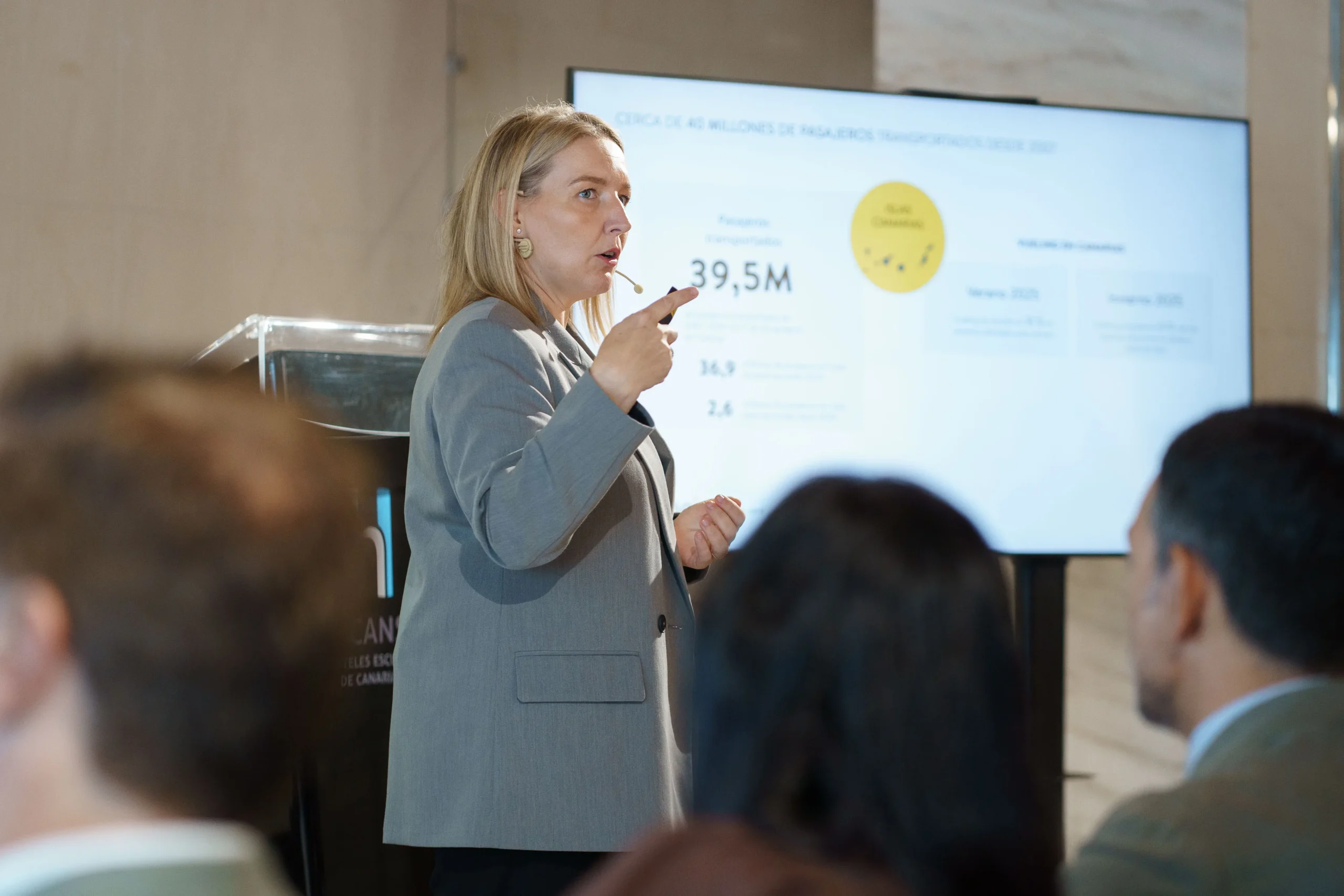 Vueling ofrece este invierno desde Canarias 32 rutas, entre ellas, cuator internacionales y 28 domésticas, lo que asegura que sitúa a la compañía en el primer operador del mercado entre Canarias y la península, según ha informado este jueves en rueda de prensa Sandra Hors, directora de Asuntos Corporativos, Marca y Sostenibilidad de la aerolínea.